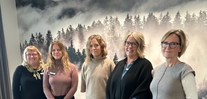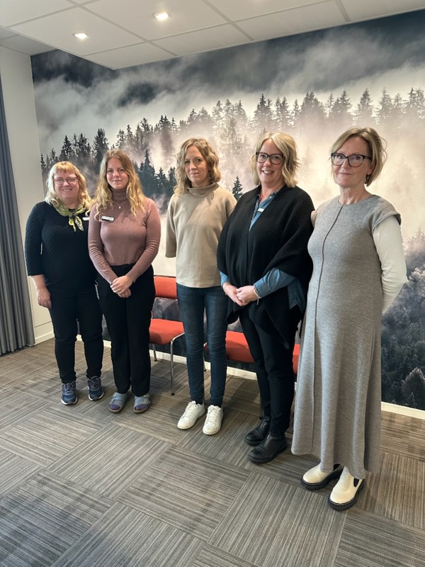 Från vänster: Kurator Helen Jonsson, Socionompraktikant Elin Granbom, Neurossköterska Karin Hagberg, Enhetschef Emma Lassen - Molander samt Neurosköterska Mariana Lindhe.