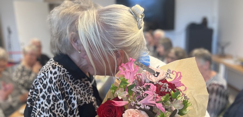 Utifrån den stora betydelse Barbro varit för vår förening - och inte minst, för våra medlemmar, enskilt såväl som kollektivt, under alla år Barbro verkat som anhörigkonsulent var det självklart att vi från föreningens sida denna dag ville dels, överlämna vackra blommor som ett synligt bevis för vår tacksamhet till Barbro för hennes otroligt viktiga insats för vår förenings räkning, blommor vilka överlämnades av nyss nämnda Margit Viklund och dels, avnjuta smakfull prinsesstårta med för dagen, texten: Tack Barbro!